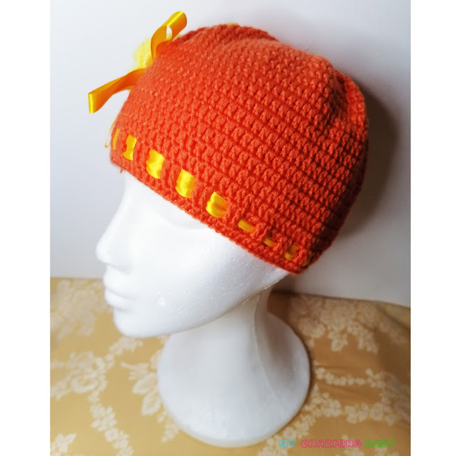 Gorro Laranja com Fita seda. Flor em lã com botão no formato de flor.